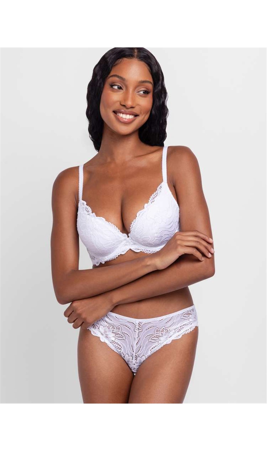 Az ANGIE kétrészes mélyen dekoltált melltartó csomag két stílusos lehetőséget kínál: finom csipkével díszített vagy és sima kosarú megoldást. Mindkét melltartó kivehető szivacsbetéttel és merevítős kosarakkal rendelkezik a testre szabható viselet érdekében. A melltartó a hozzá illő alsó résszel tökéletes szettet alkot.